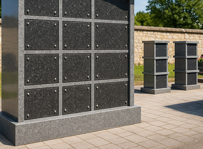 Nos équipes interviennent également auprès des mairies et collectivités locales pour la conception et l’installation de columbariums, caves-urnes et espaces cinéraires.